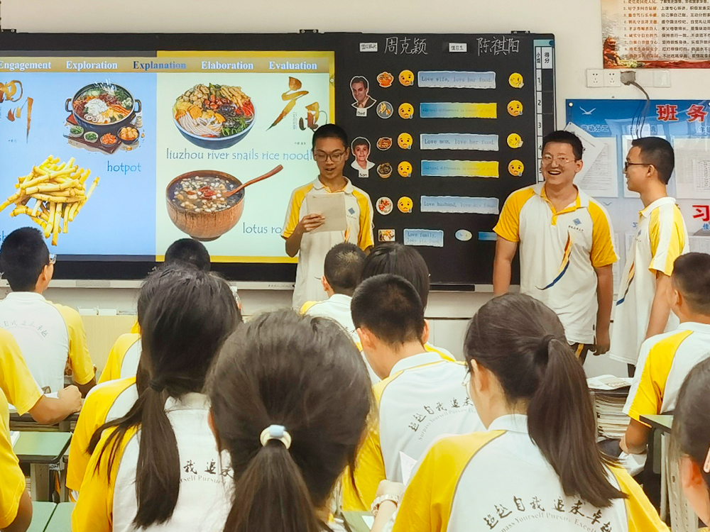 首先,唐新老师带来了一堂“A Child of Two Cuisines”的阅读课。唐老师的课运用了M-PWP的阅读教学模式,即:通过小组合作学习为主要学习形式,以图式思维工具(Mind map)为载体,通过“创设情境,激发阅读兴趣——据图阅读,提升阅读能力——拓展延伸,实现知识迁移”的阅读前、中、后三个环节,为课堂操作流程的英语阅读模式。课上,课堂气氛热烈,学生积极活跃,亮点频频爆出,给人印象深刻。授课老师以深入浅出的讲解、生动有趣的互动,引领学生畅游知识的海洋。学生们紧跟老师的节奏,争相展示自我,让课堂焕发出勃勃生机。